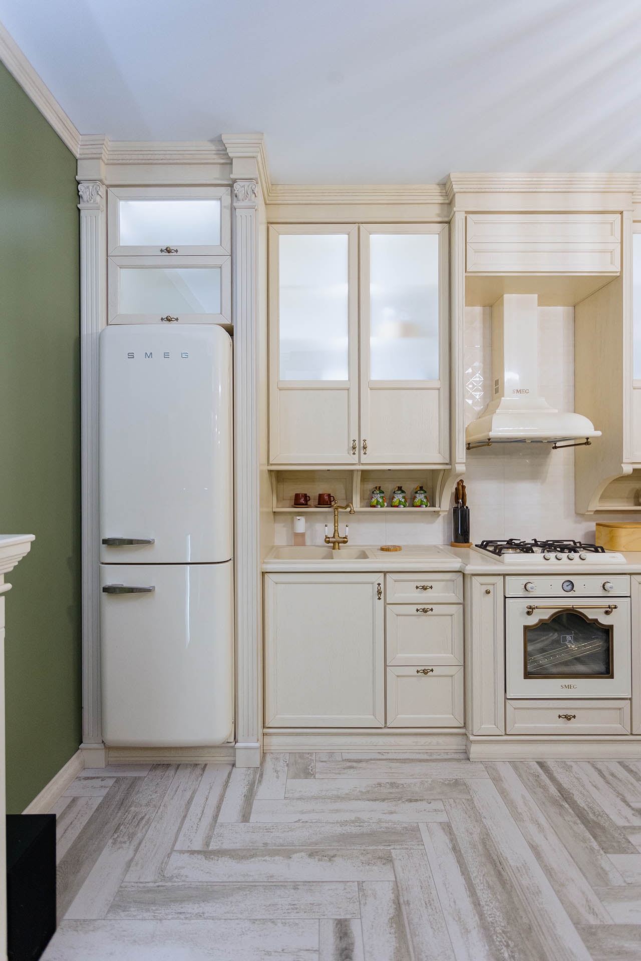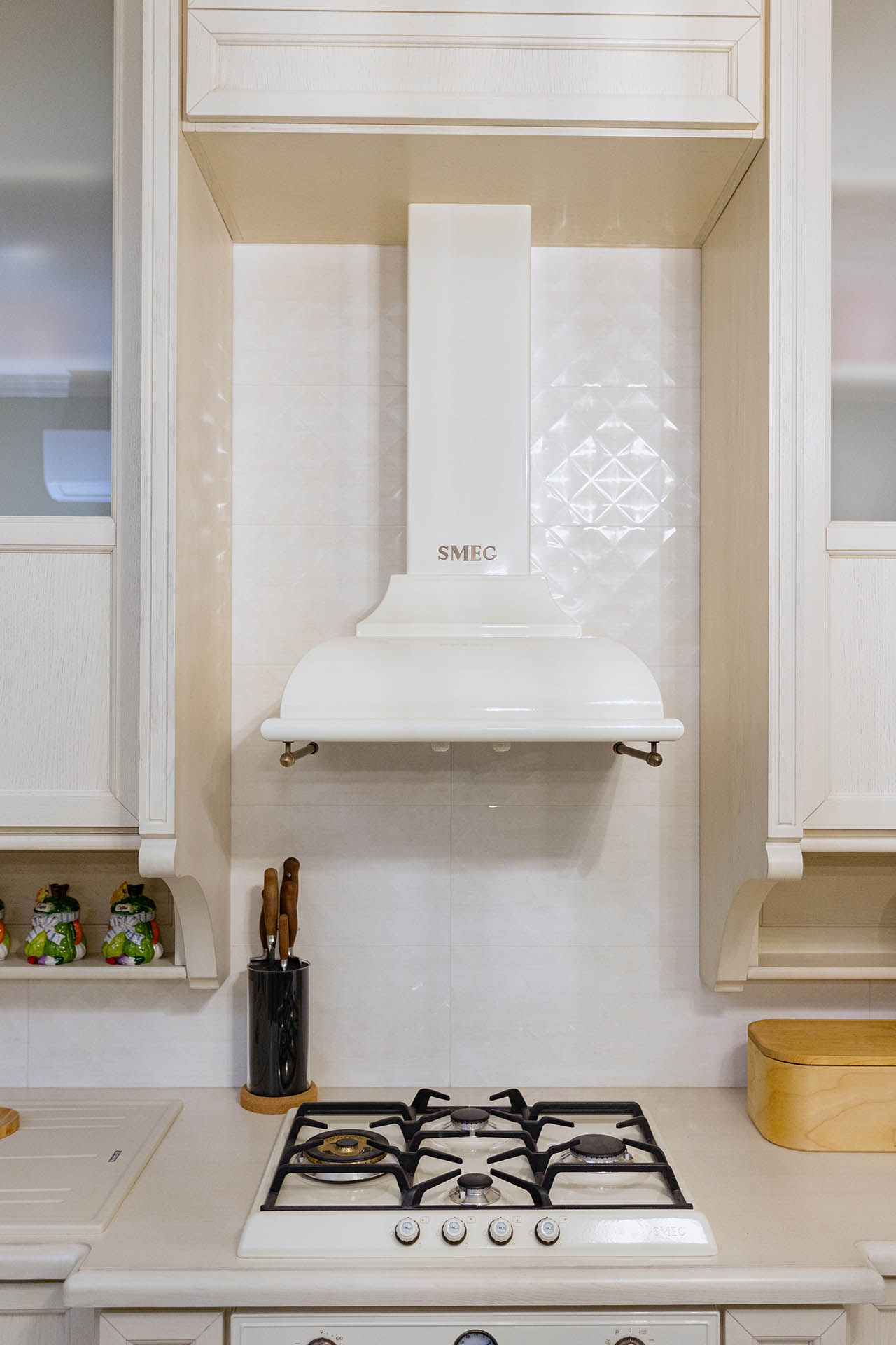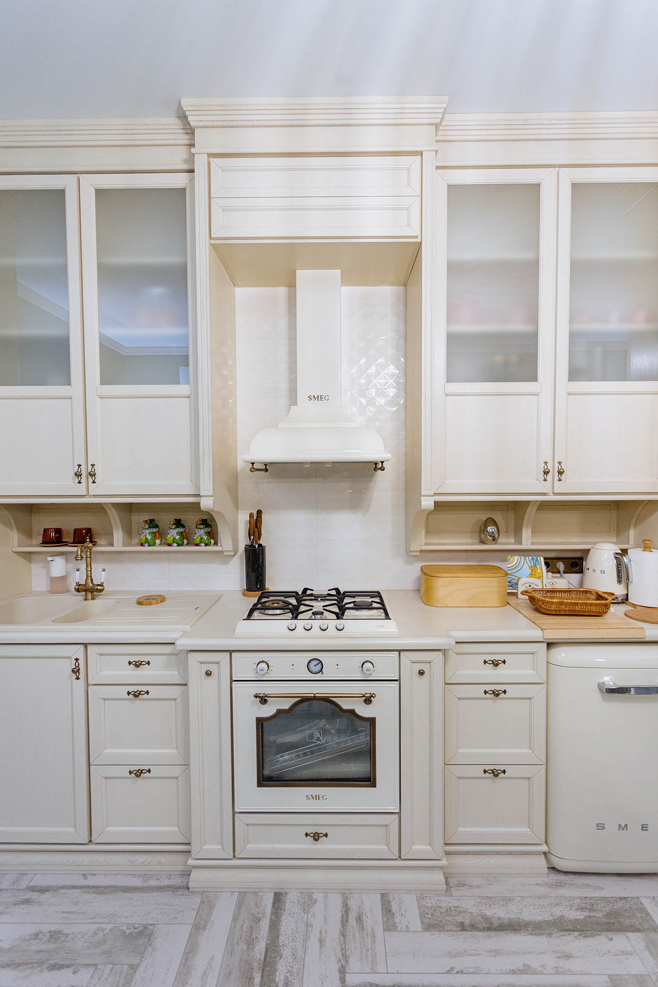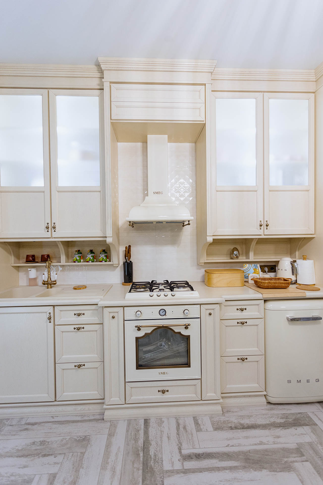 На фоне светлой палитры выделяются стильные стеклянные панели на фартуке, добавляющие современный акцент и отражая свет. Также присутствует хорошая освещенность, что делает кухню уютной и функциональной.