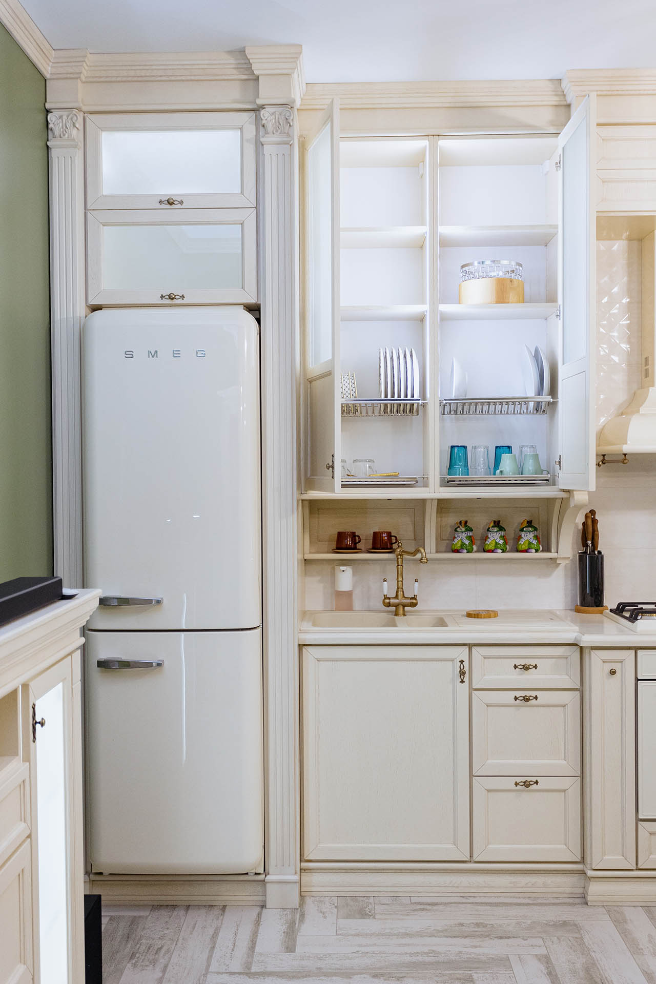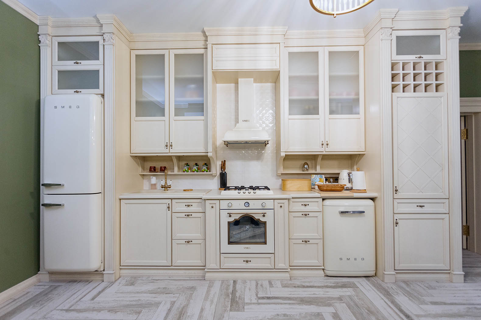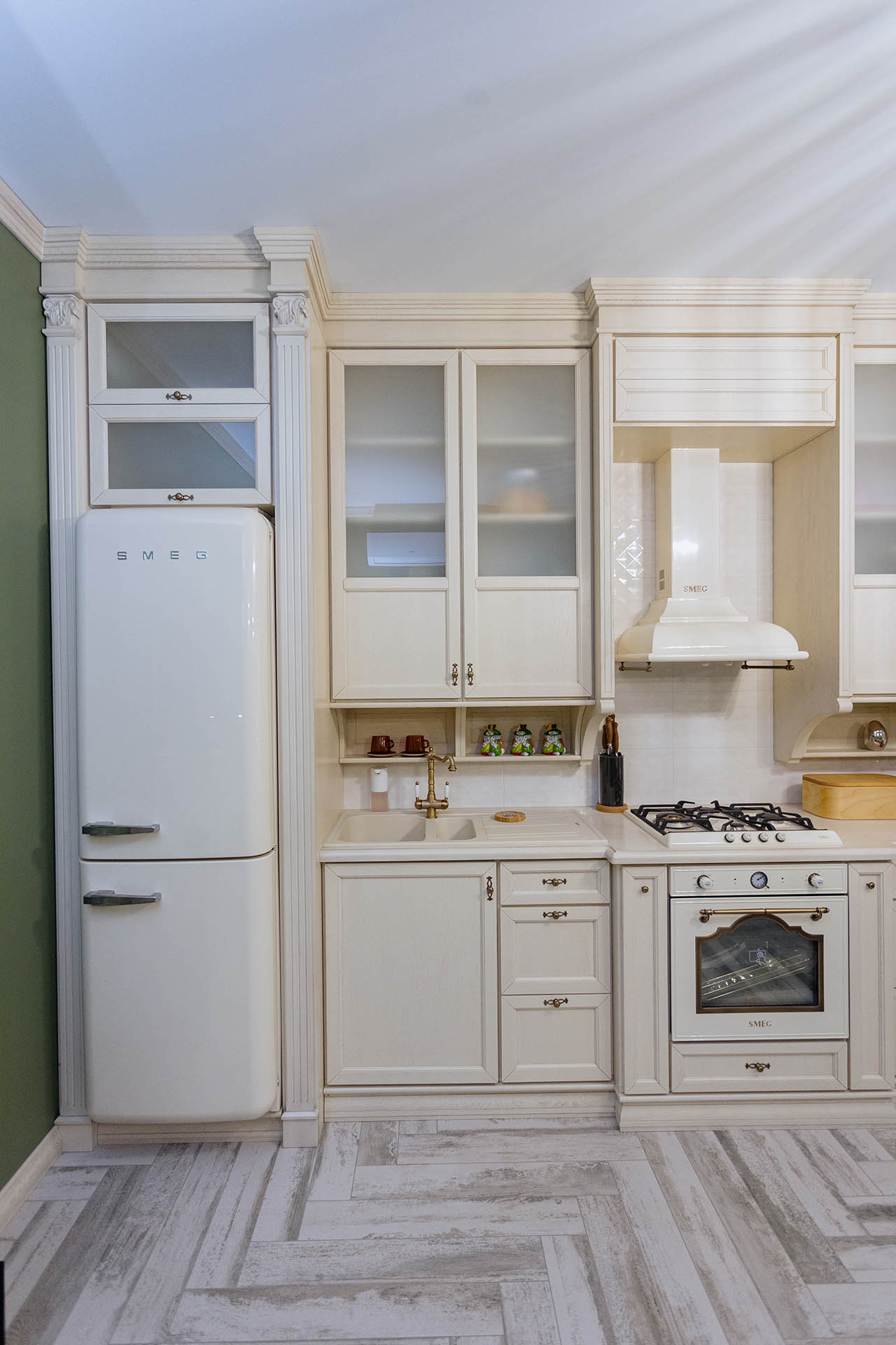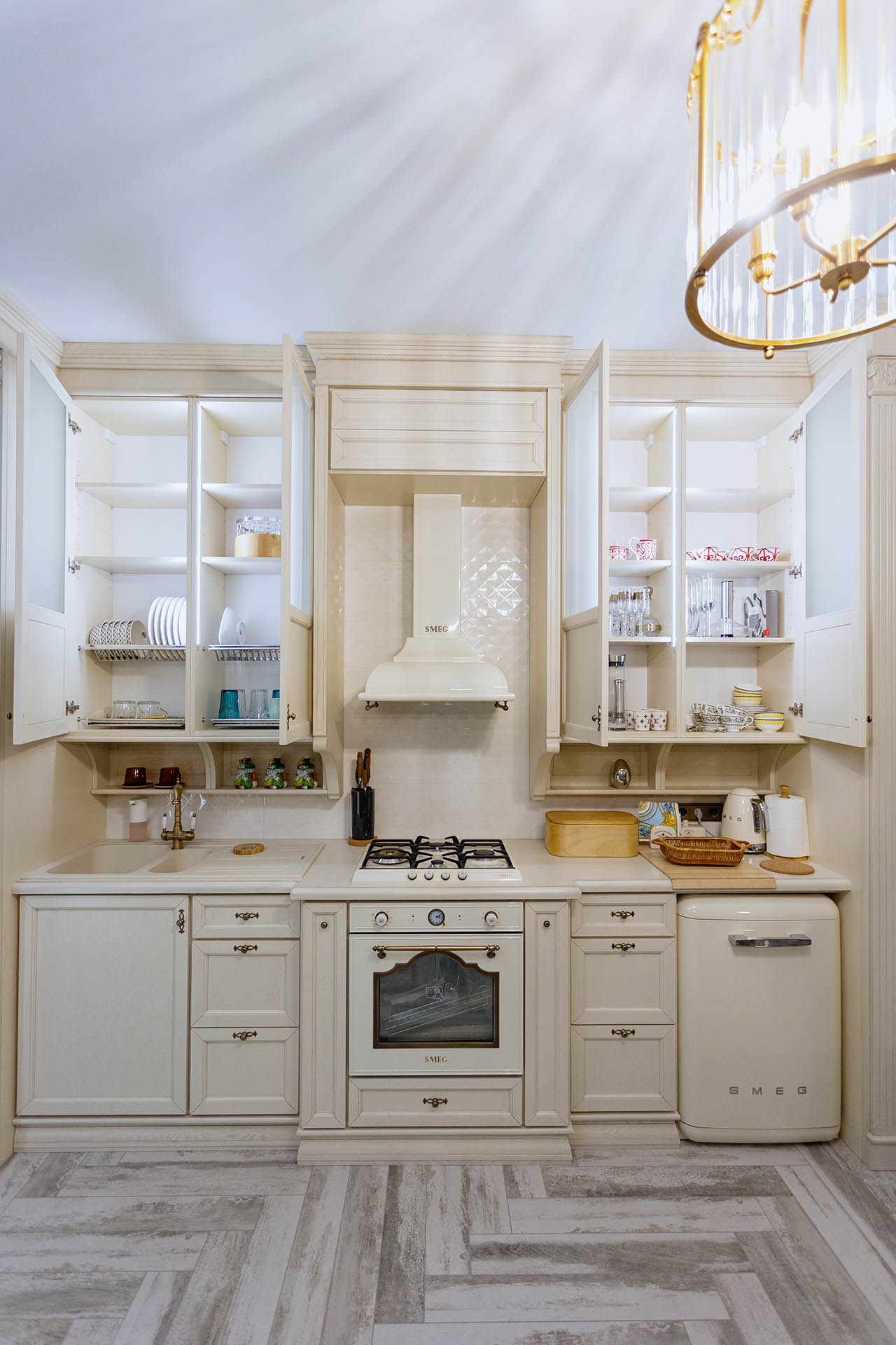 На фоне светлой палитры выделяются стильные стеклянные панели на фартуке, добавляющие современный акцент и отражая свет. Также присутствует хорошая освещенность, что делает кухню уютной и функциональной.