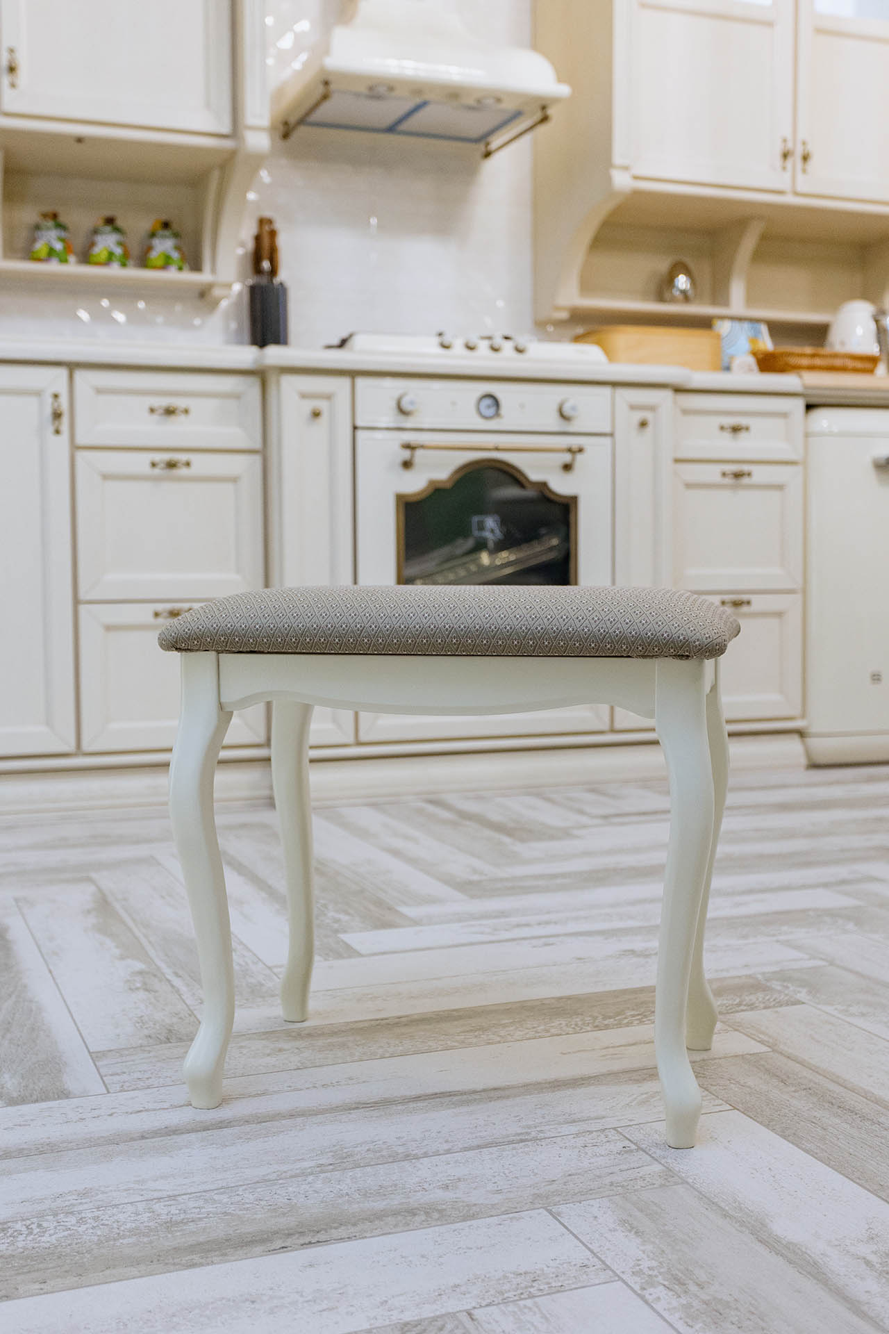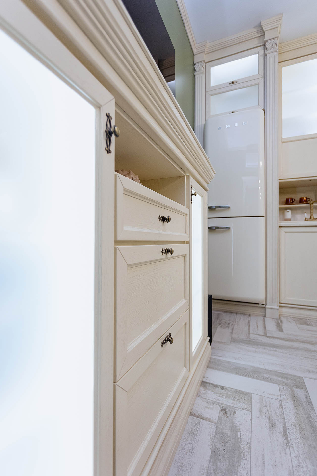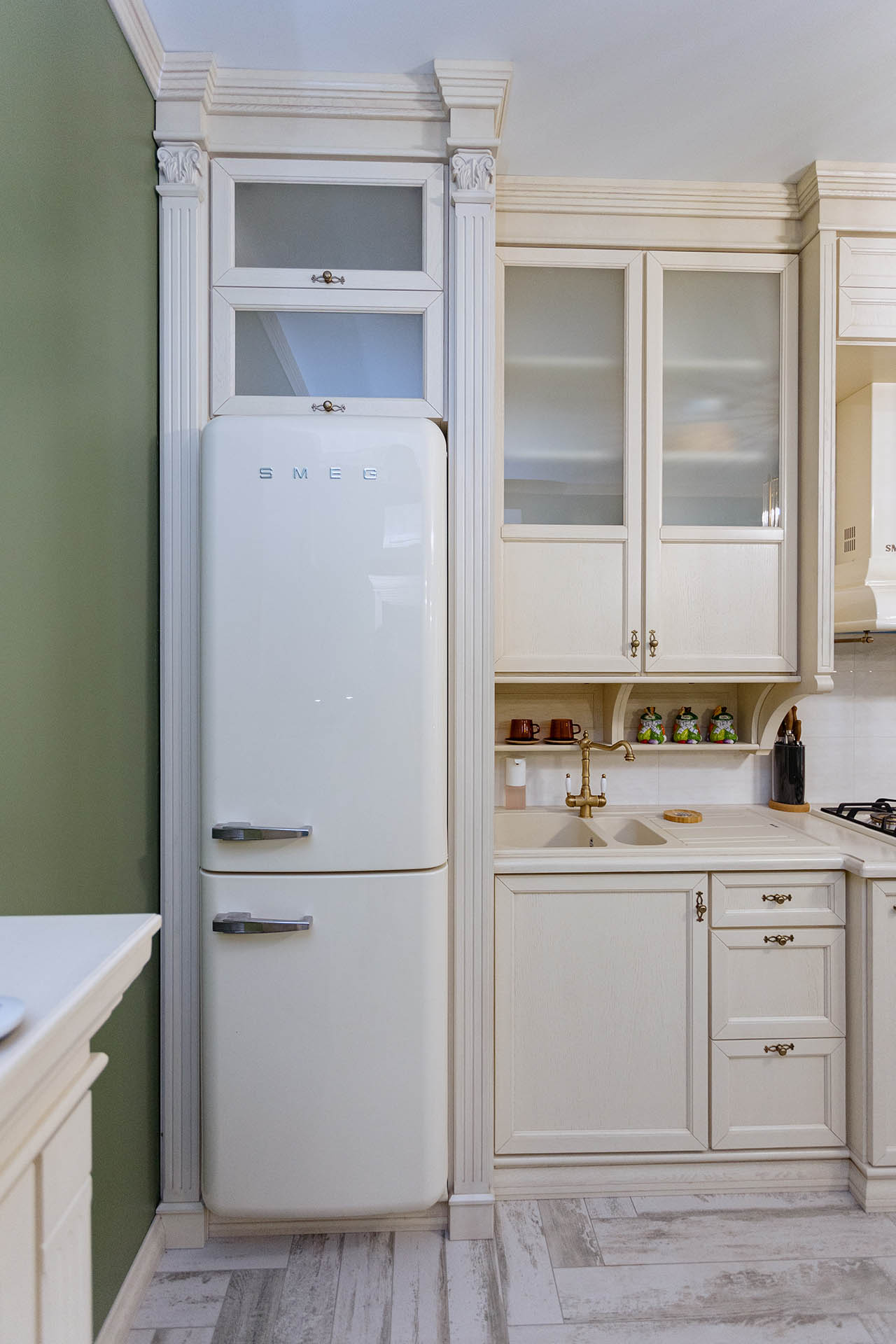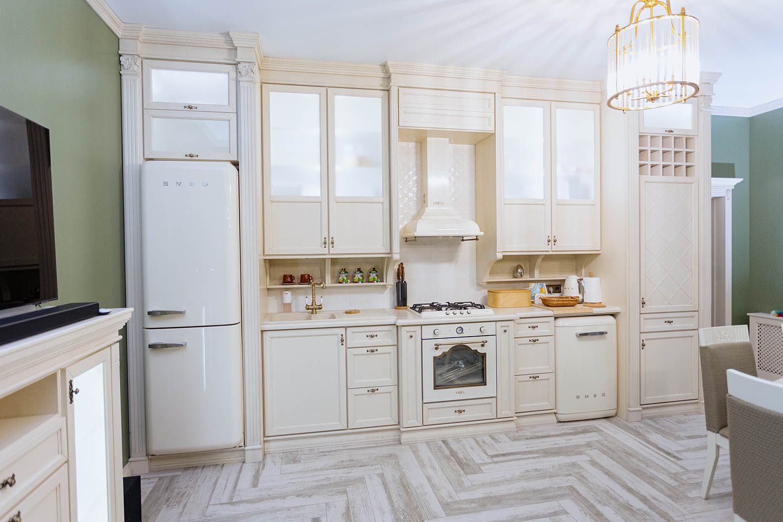 На фоне светлой палитры выделяются стильные стеклянные панели на фартуке, добавляющие современный акцент и отражая свет. Также присутствует хорошая освещенность, что делает кухню уютной и функциональной.