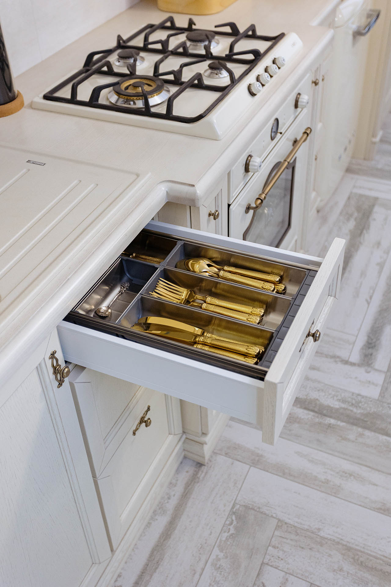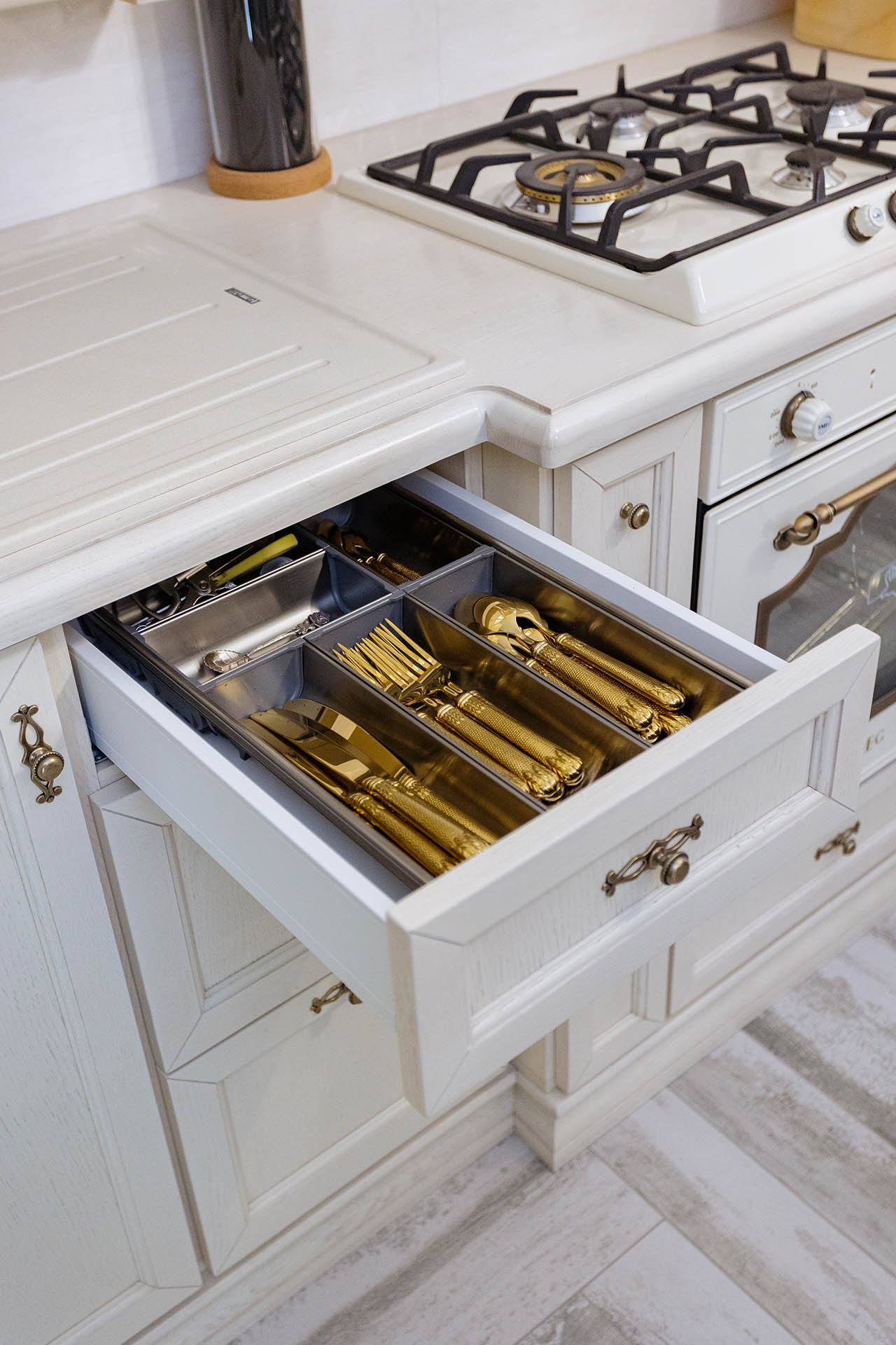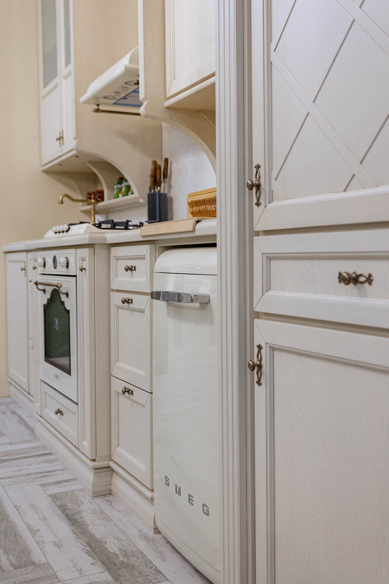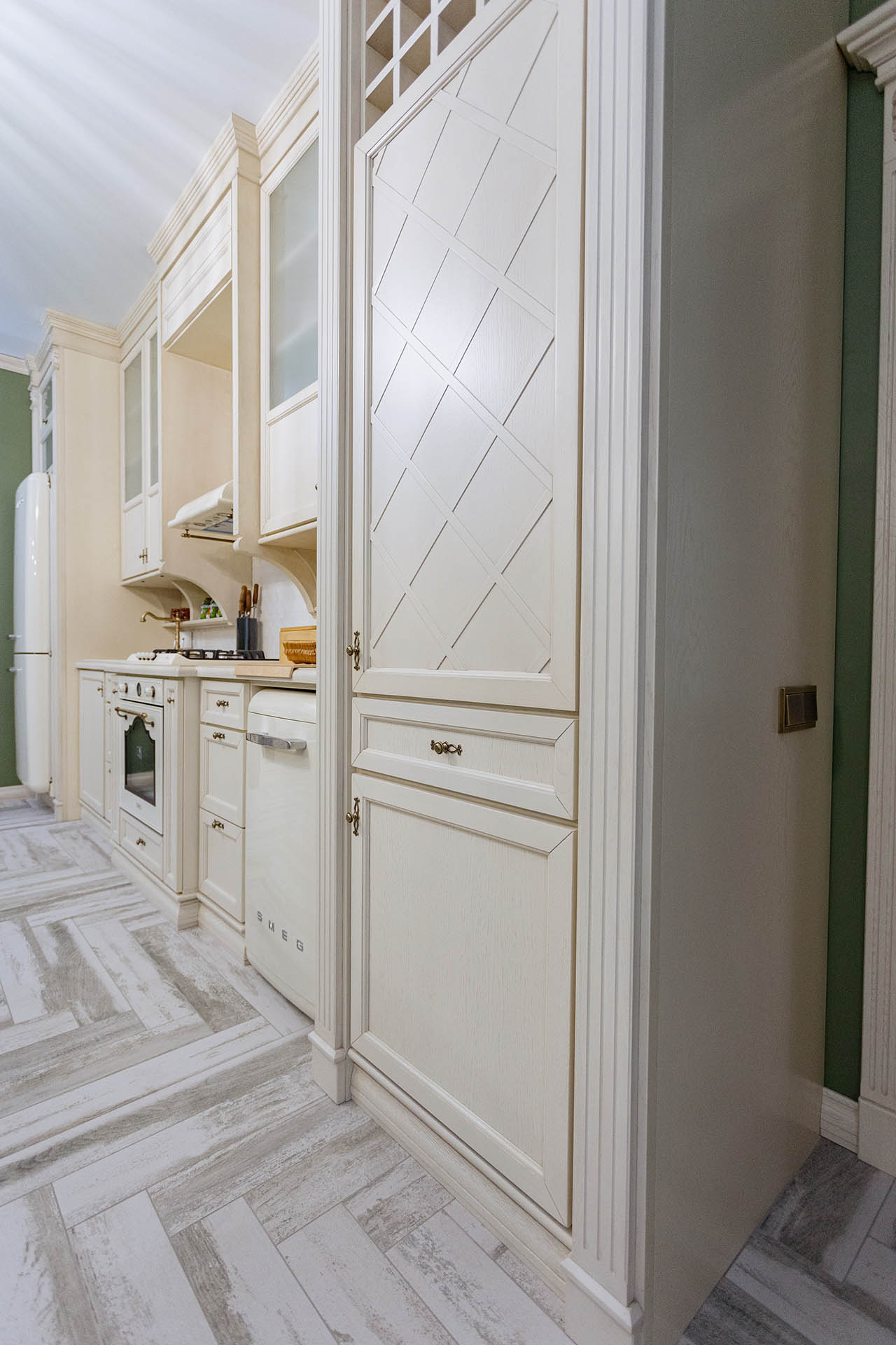 Кухня в светлом цвете воплощает свежесть и легкость в каждой детали. Стены оформлены контрасным оттенком, который придает помещению ощущение простора и света. Кухонные шкафы и столешница выполнены в нейтральных, светлых тонах, создавая чистоту и гармонию в интерьере.