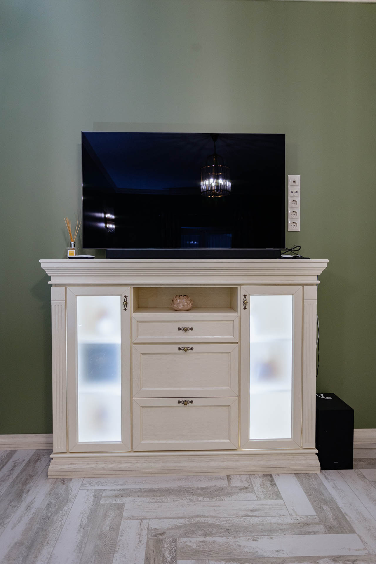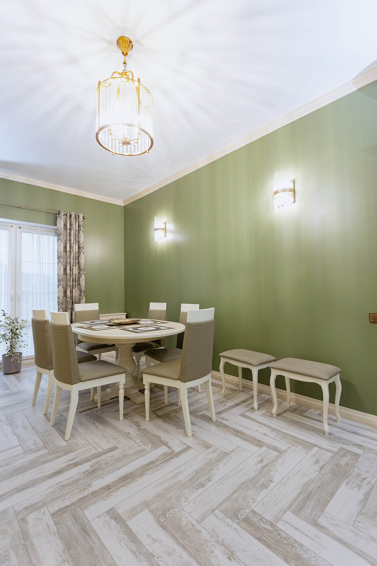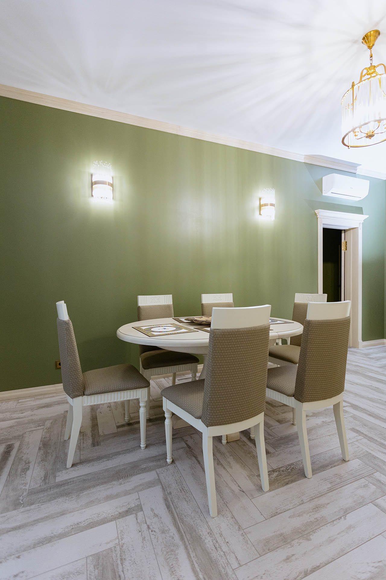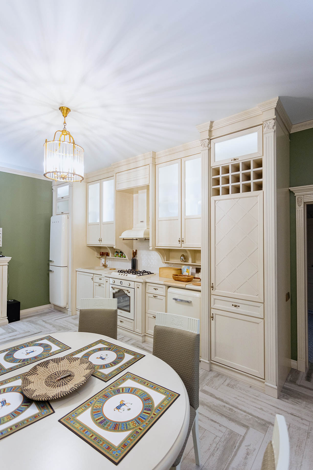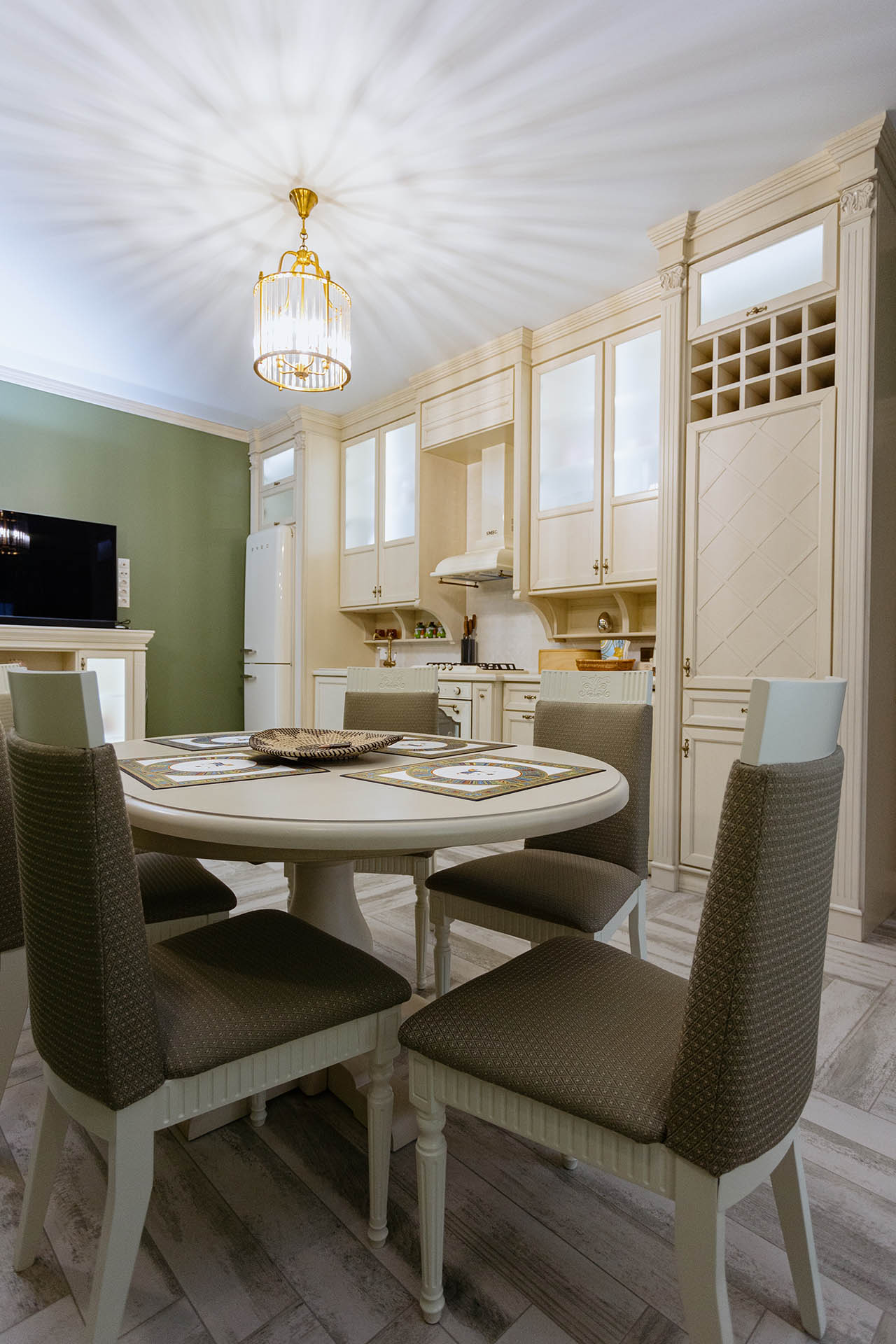 Мягкий свет потолочных ламп создает приятную атмосферу, а акцентные элементы, такие как декоративные подвесные светильники, придают интерьеру индивидуальность. Кухонная зона в светлых тонах представляет собой идеальное место для приготовления пищи, обедов и семейных посиделок, создавая пространство, наполненное светом и уютом.