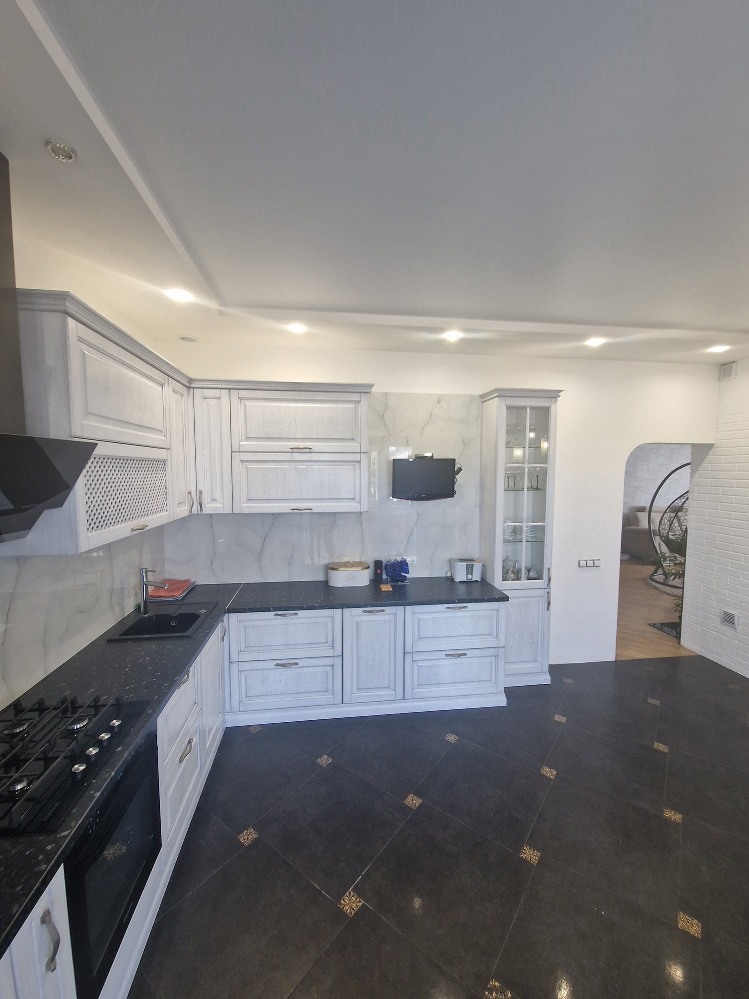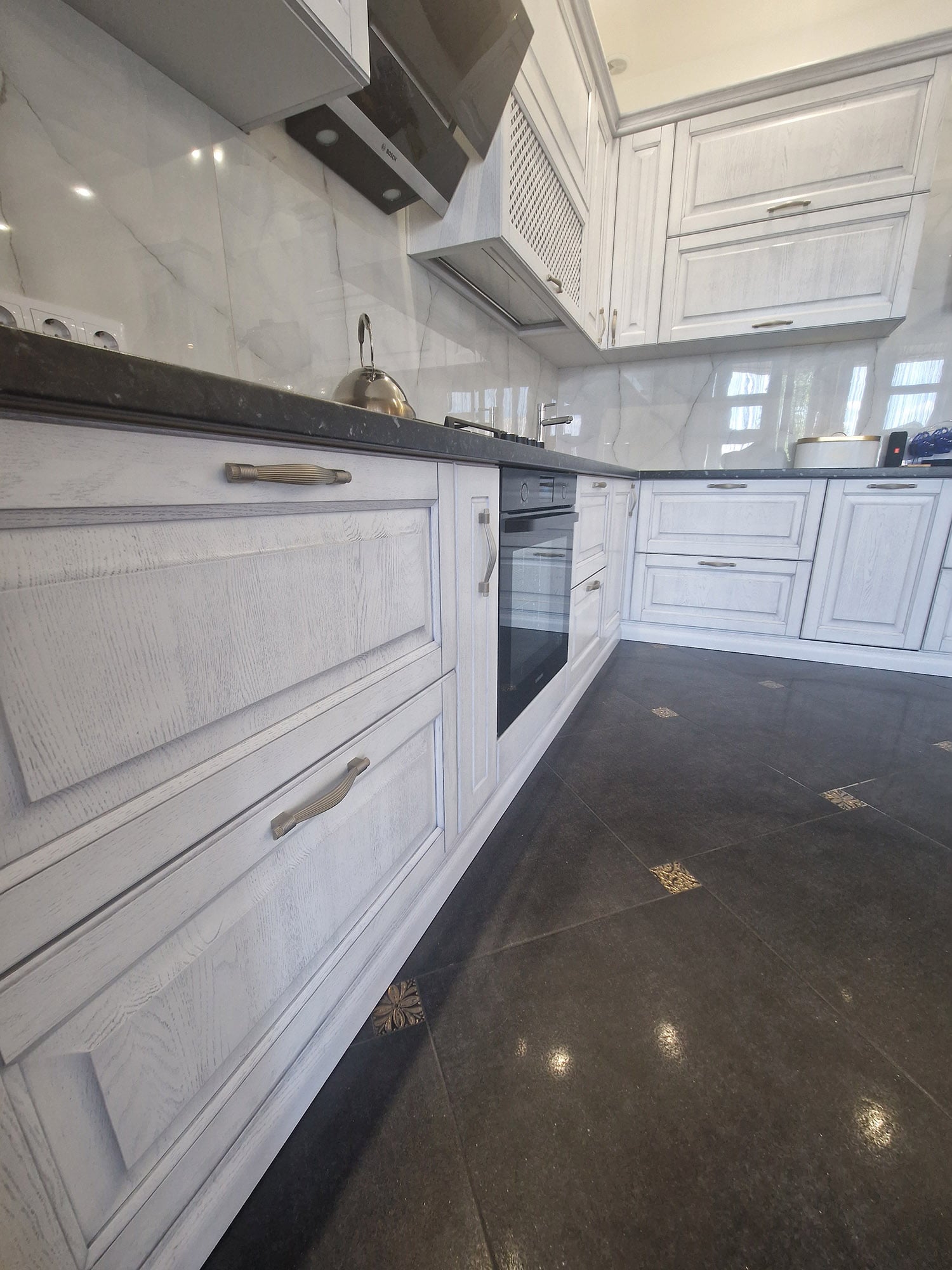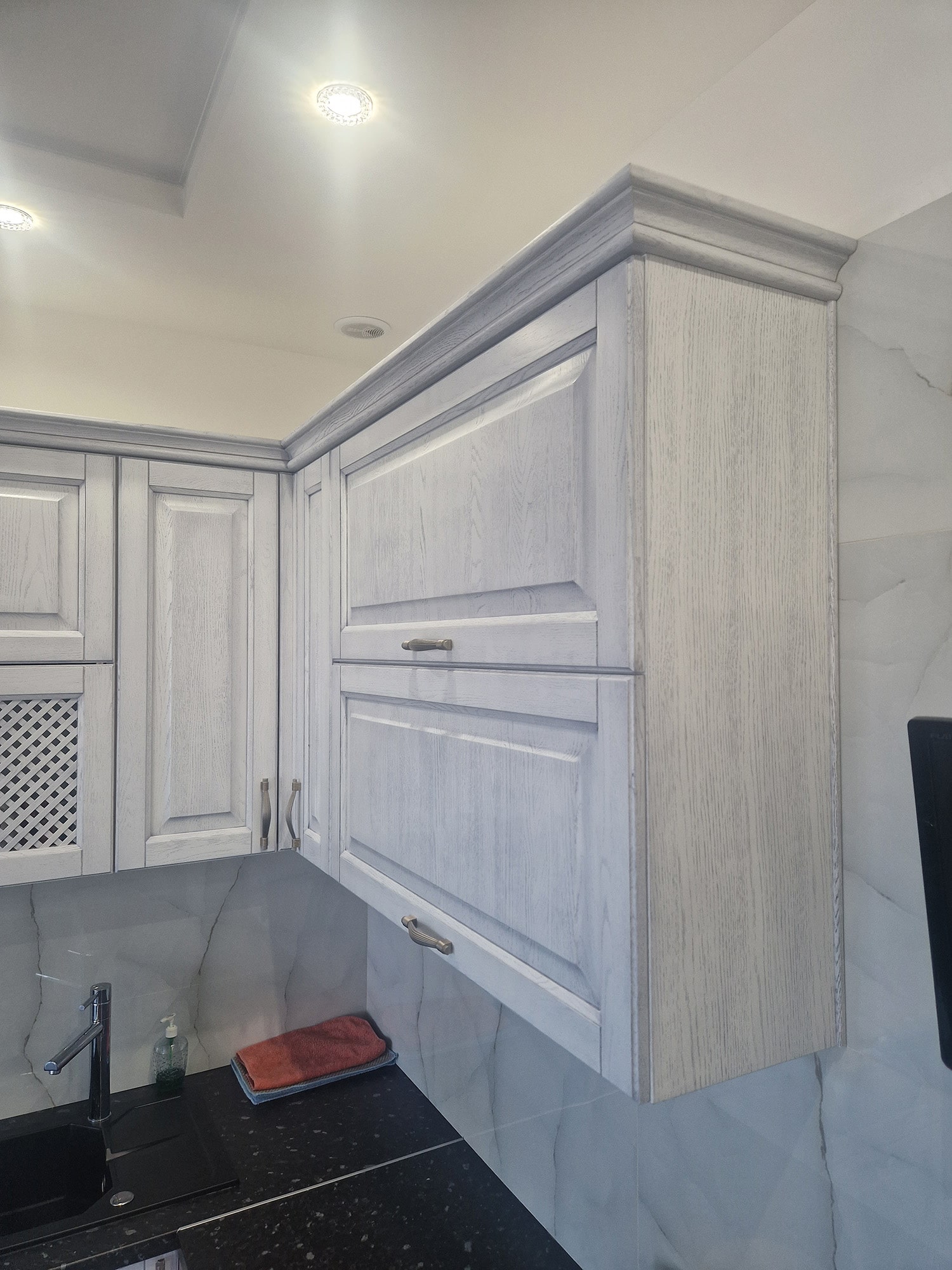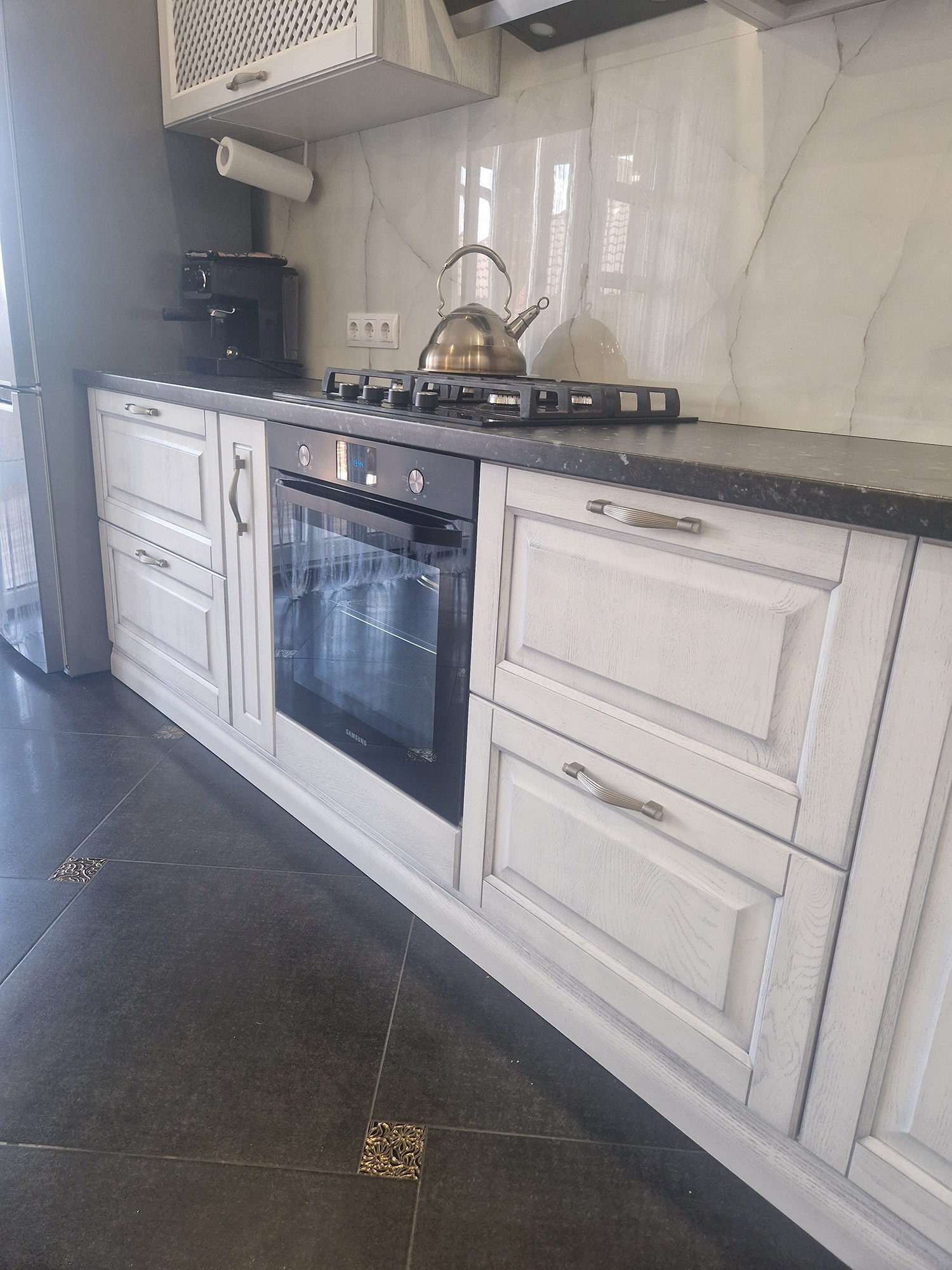 Столешницы могут быть изготовлены из мрамора или других благородных материалов, придающих кухне роскошный характер. Детали мебели, такие как декоративные ручки и резные элементы, могут быть выполнены в золотых или серебряных оттенках, добавляя изысканности и шарма.