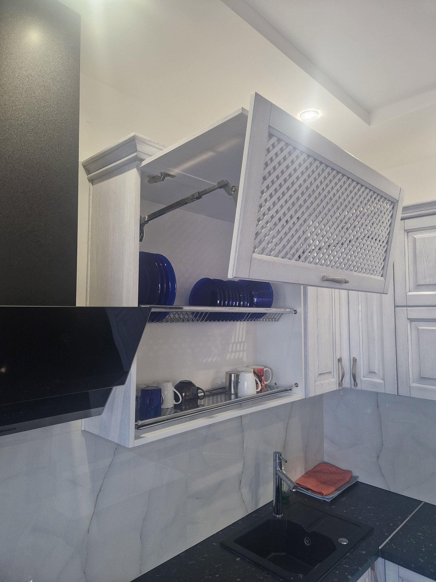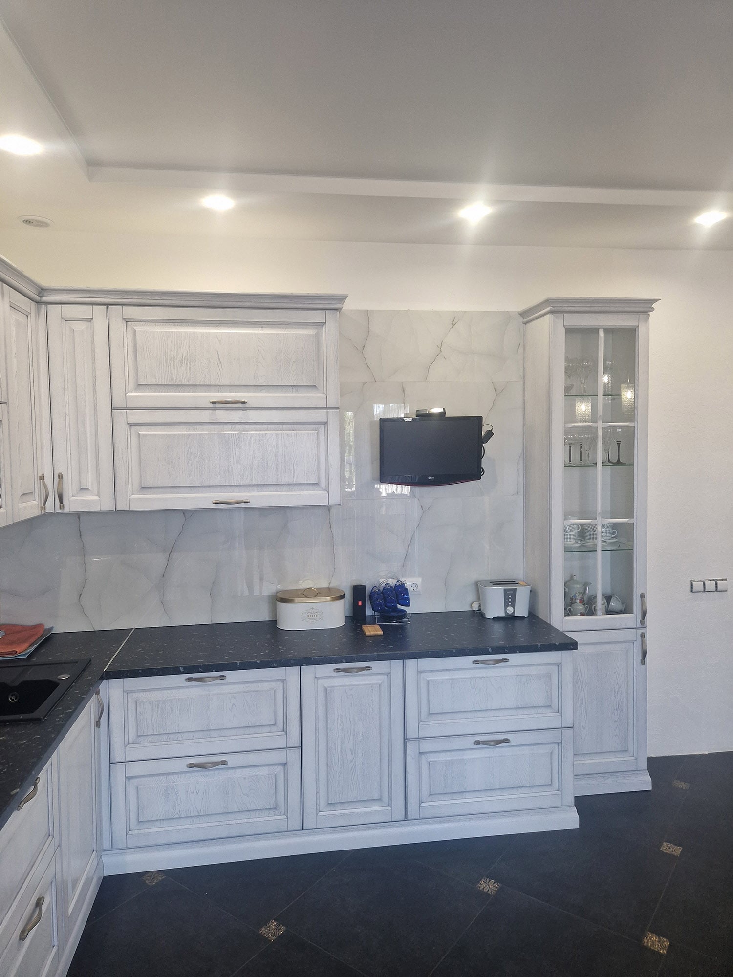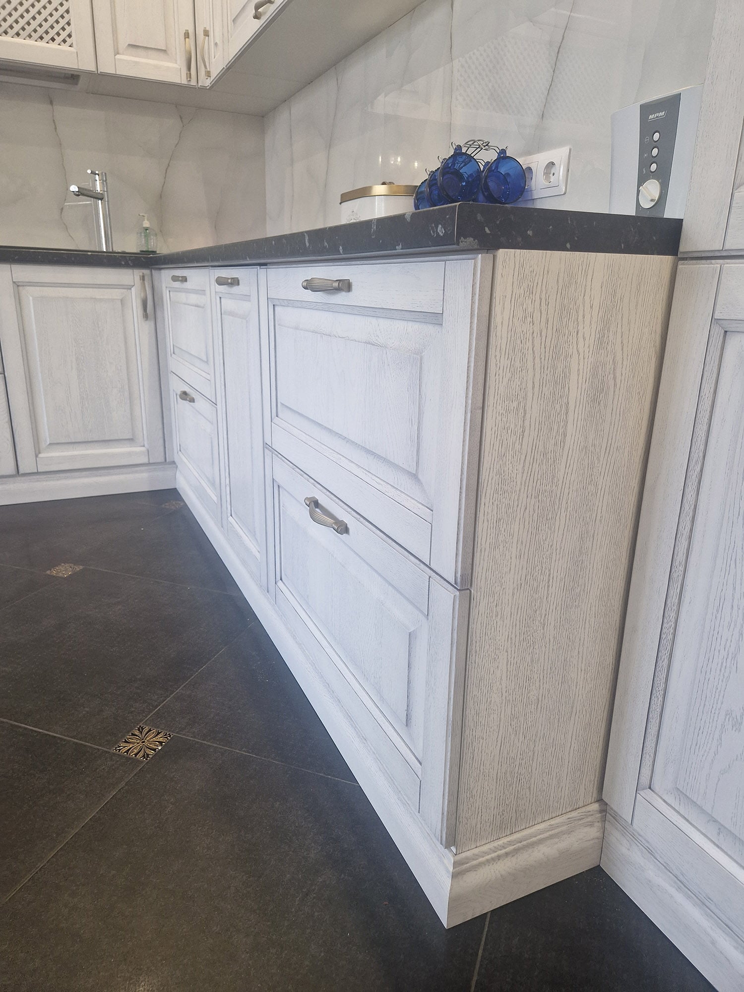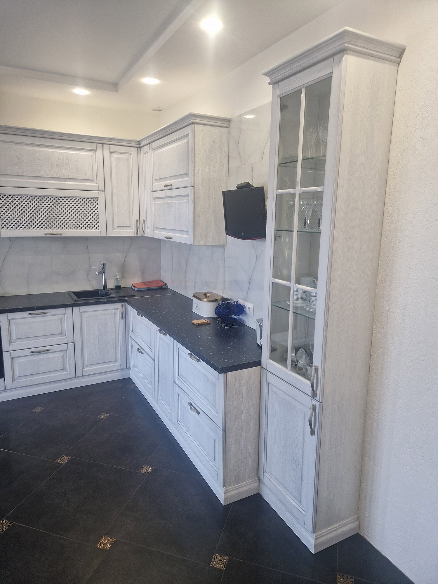 Столешницы могут быть изготовлены из мрамора или других благородных материалов, придающих кухне роскошный характер. Детали мебели, такие как декоративные ручки и резные элементы, могут быть выполнены в золотых или серебряных оттенках, добавляя изысканности и шарма.