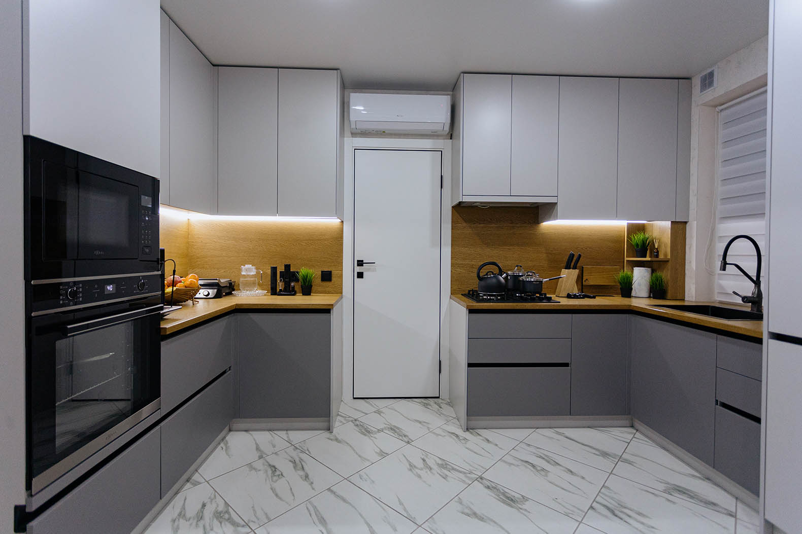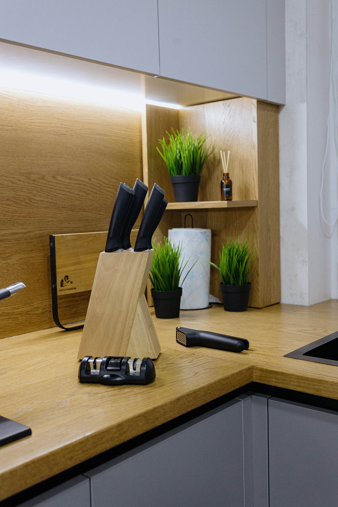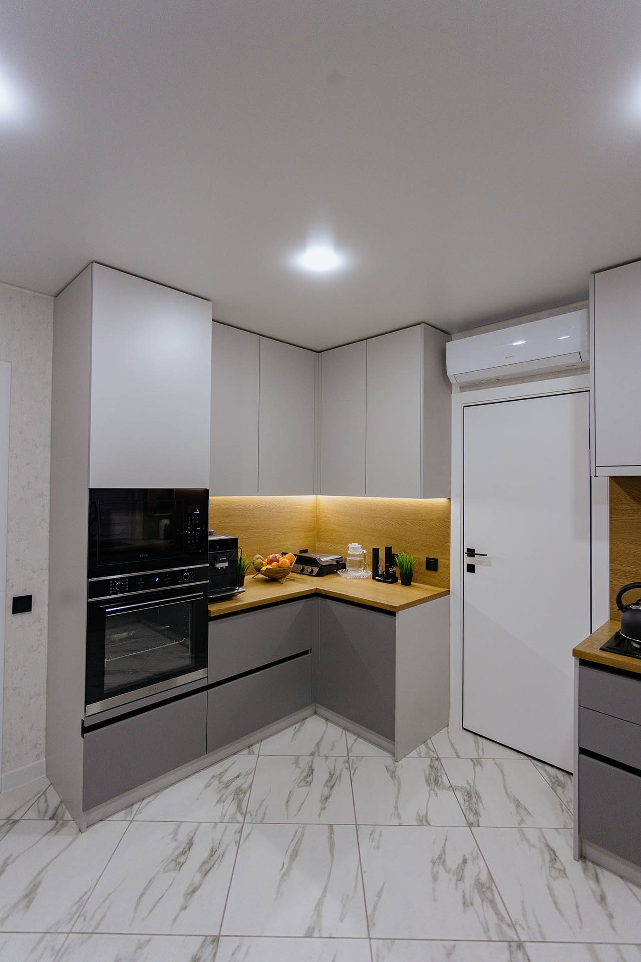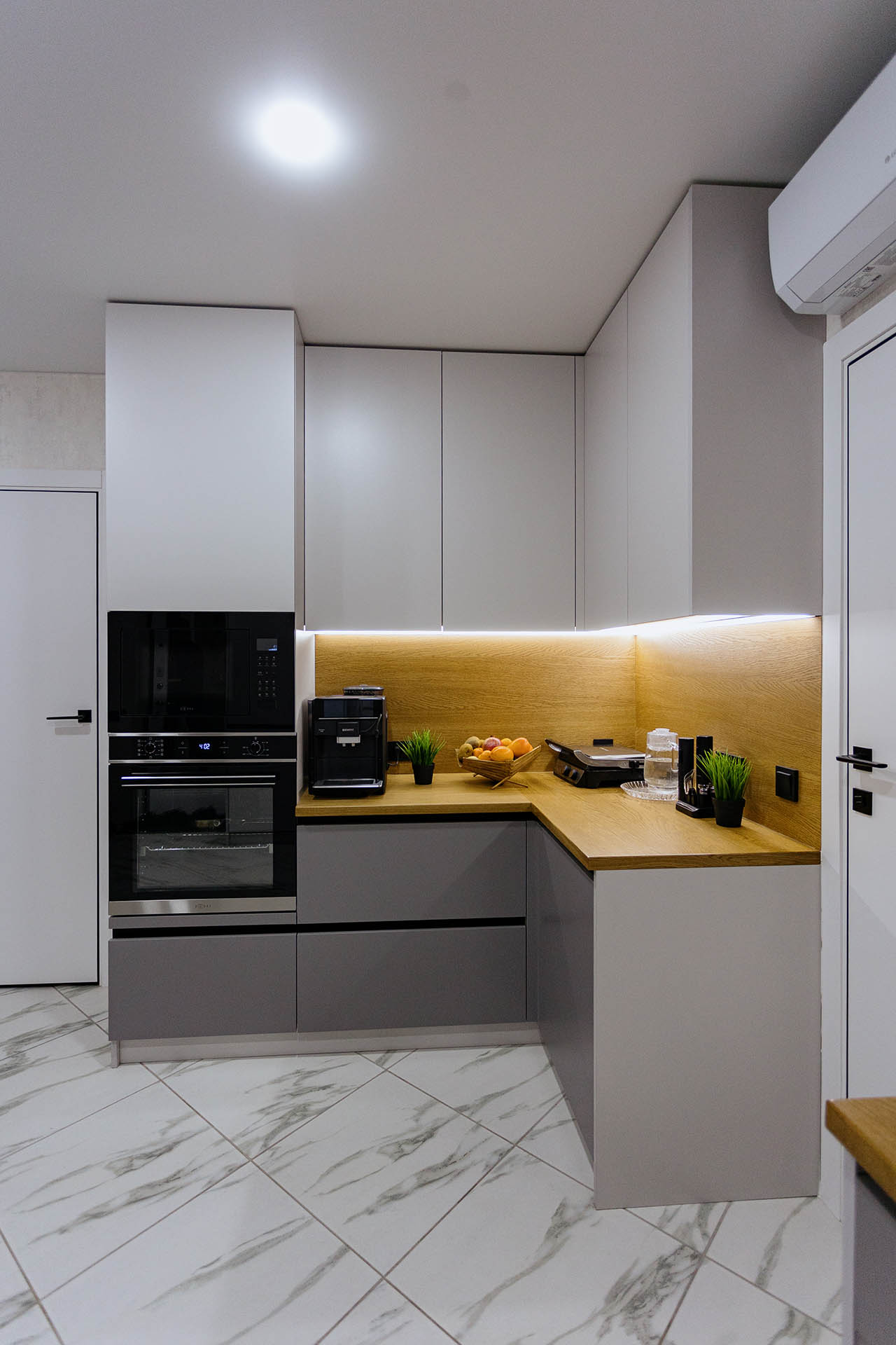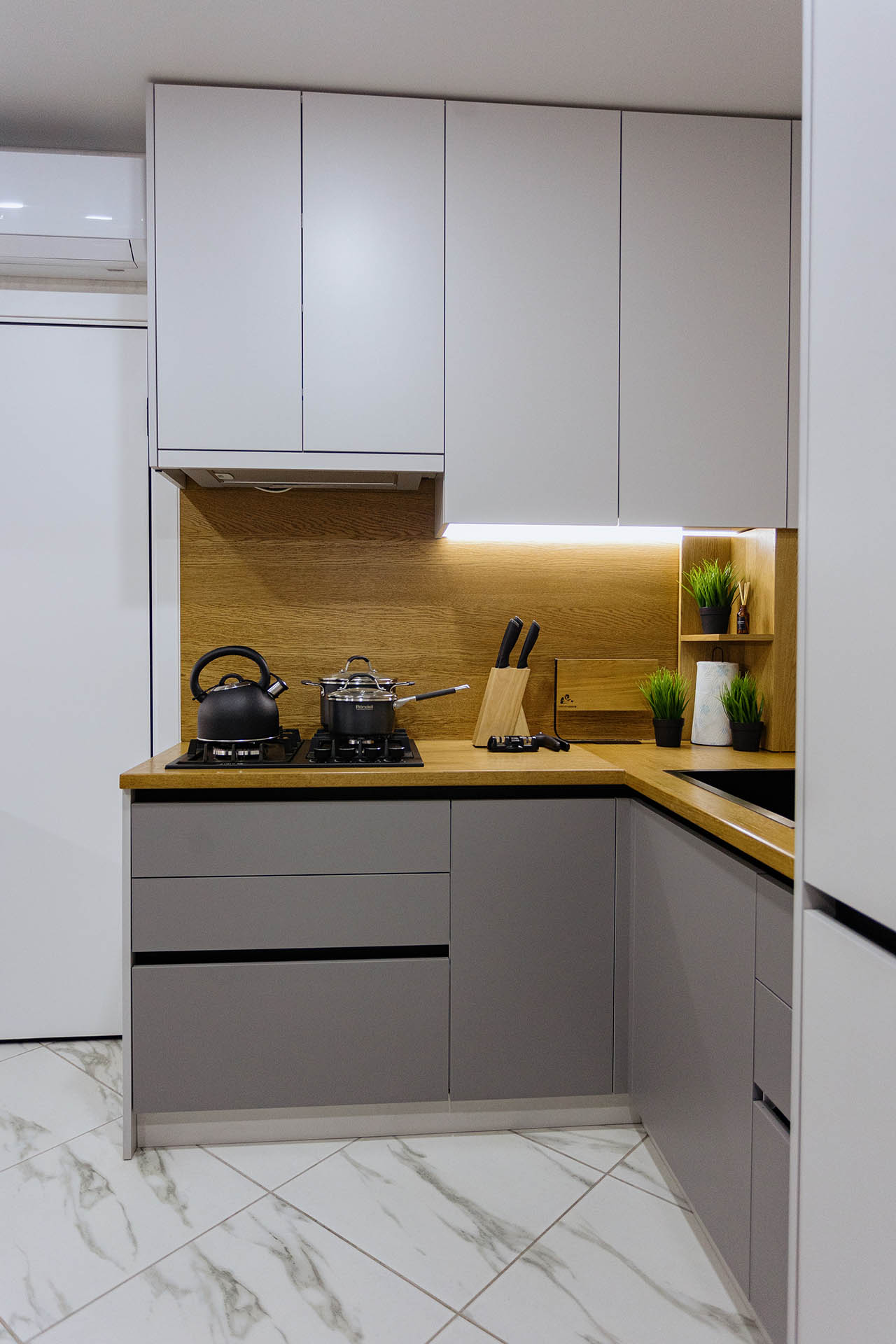 Кухня на заказ в светлых оттенках серого представляет собой элегантное и современное пространство, где каждая деталь проработана с учетом индивидуальных предпочтений. Столешница и фартук выполнены из натурального дерева, придающего интерьеру теплоту и природную красоту. Серые оттенки создают легкость и визуальное пространство, а использование дерева добавляет натуральности и уюта. В результате получается функциональная и стильная кухня, которая сочетает в себе современный дизайн и теплую атмосферу естественных материалов.