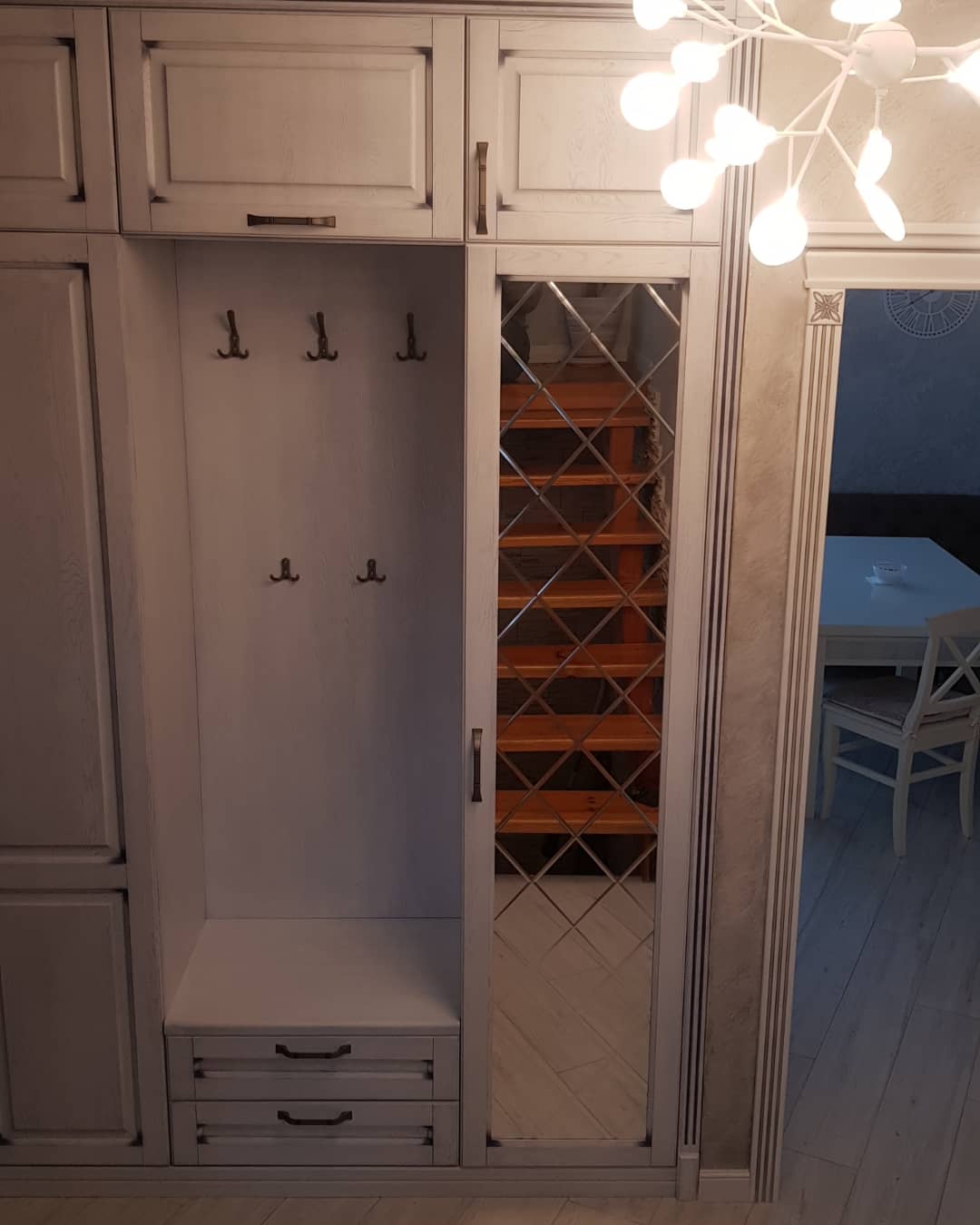 Эта прихожая — идеальное воплощение светлых и воздушных интерьеров. Основным акцентом здесь является использование натуральных светлых оттенков, которые придают помещению невесомость и легкость. Благодаря светлой отделке, комната наполняется светом, создавая уютную и приветливую атмосферу.